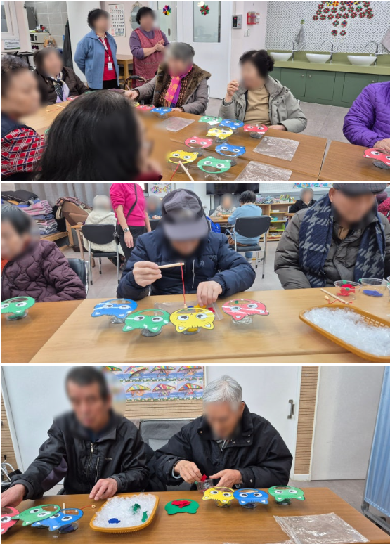 물고기의 색깔에 따라 박수 치기를 다르게 하며 단기 집중력과 기억력을 활성화해 보았습니다. 예를 들어, 빨간 물고기를 잡았을 때는 두 번 박수를 치고, 파란 물고기를 잡았을 때는 한 번 박수를 쳐보면서 어르신들의 기억력과 시지각력을 높였고, 낚시를 하며 집중력과 소근육 자극을 길러보았습니다.