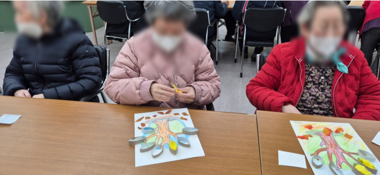 먼저 도화지에 그려진 나무 밑그림을 색칠했어요. 어르신들은 저마다 좋아하는 색깔로 나무의 옹이와 나뭇결을 정성껏 표현하시며, 소근육을 섬세하게 움직이셨답니다.
