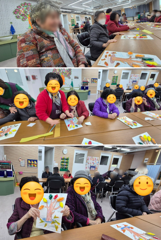마지막으로 가을 분위기를 물씬 풍기는 나뭇잎 모형을 붙여 예쁜 낙엽을 표현해 주셨어요. 어르신들의 창의력이 더해져 세상에 하나뿐인 멋진 가을나무가 완성되었습니다!