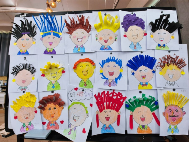 색종이를 말아서 표현 하거나 오리기, 구겨서 찢기 등 여러가지 형태의 머리카락이 표현되며 창의력을 발휘할 수 있는 즐거운 시간이었습니다.