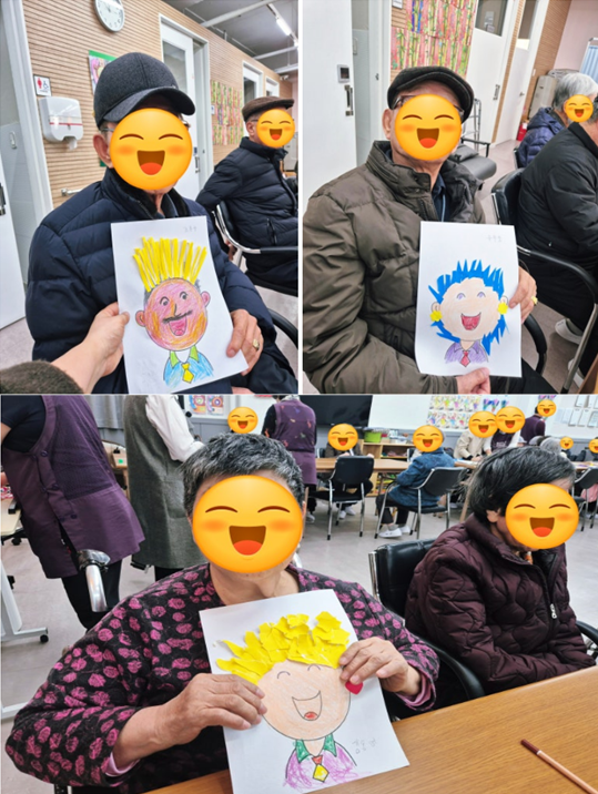 어르신들이 밑그림 색칠위에 색종이로 직접 내 얼굴 꾸미기를 해주셨습니다.