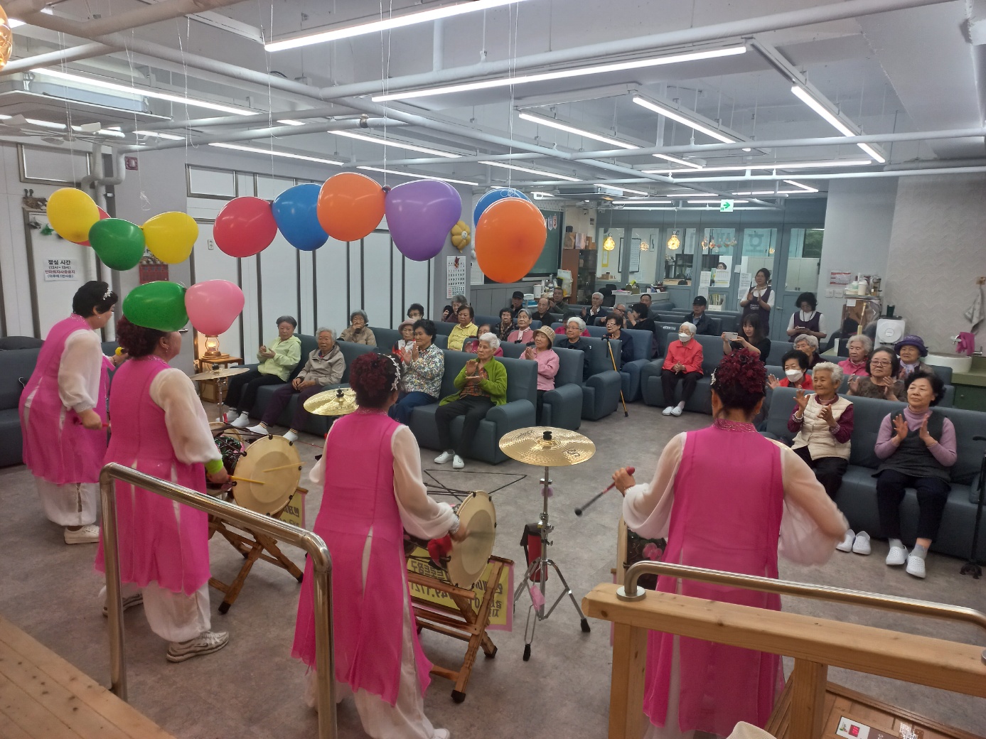찾아주신 공연팀 분들이 장구장단에 안무까지 준비하셔서  우리 어르신들의 어깨가 들썩들썩합니다.