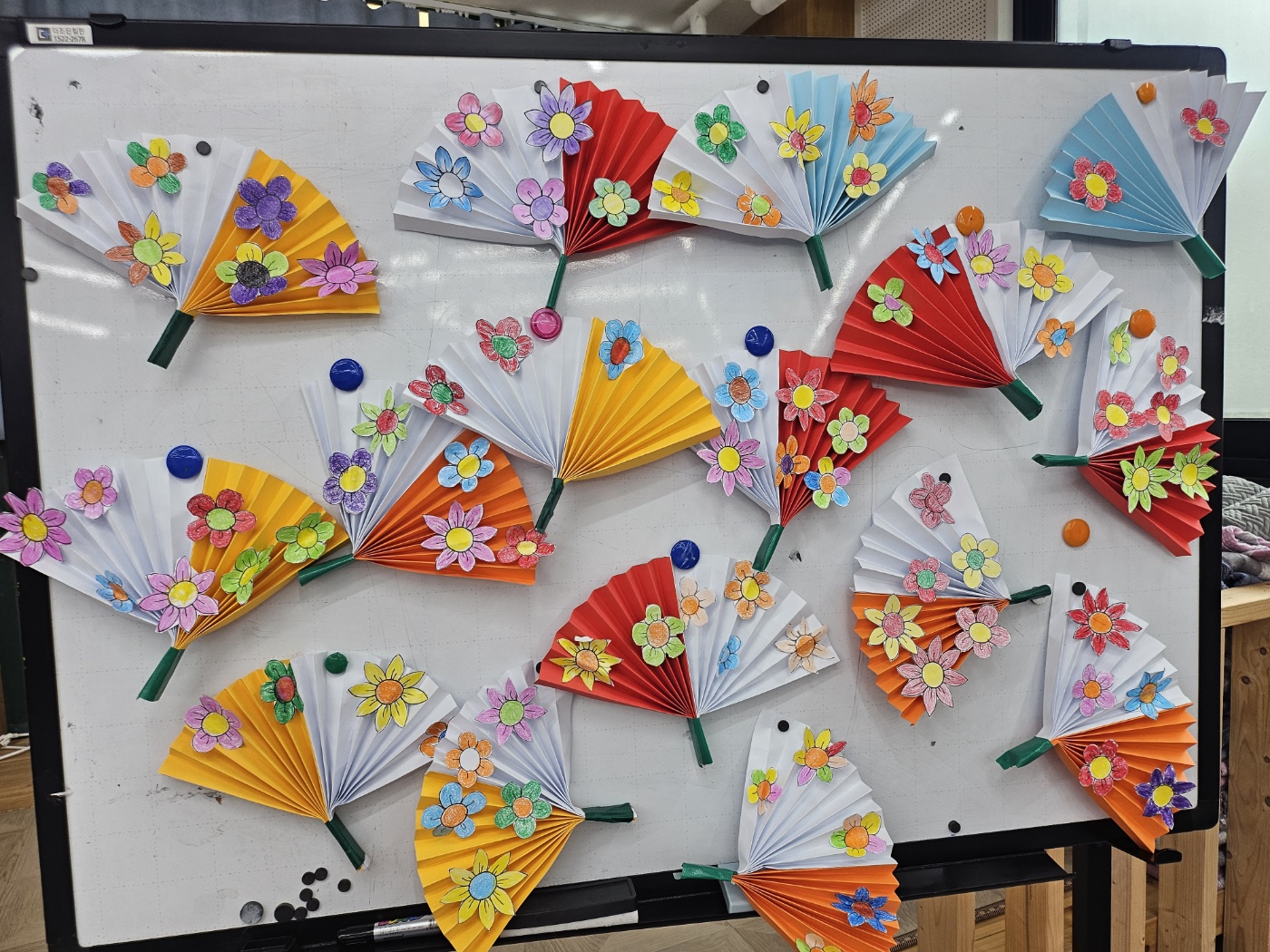 뇌자극을 위해 부러 접기과정을 시도한부채 만들기( 접기가 어려운 어르신들은 선생님들의 도움을 받아 부채를 만들어 예쁘게 꾸며보았습니다.)