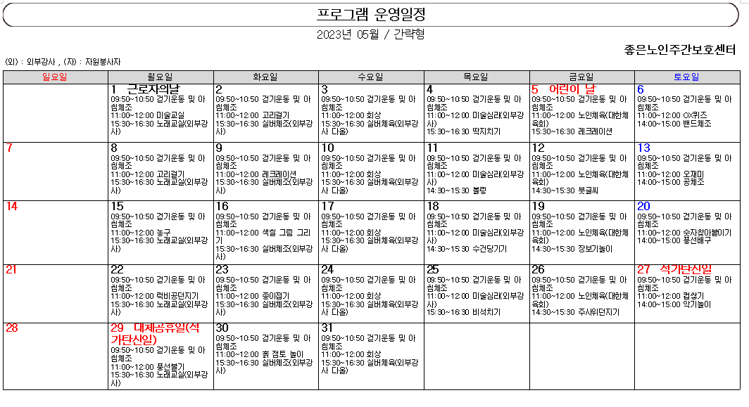 2023년 5월 프로그램 입니다 *^^* 페이지 정보 작성자 최고관리자 작성일 23-05-01 17:24 조회 276회 댓글 0건 본문 2023년 5월 프로그램 입니다 *^^* 이전글2023년 6월 프로그램 입니다 *^^* 다음글2023년 4월 프로그램 입니다 *^^* 목록 댓글목록 0 댓글목록 등록된 댓글이 없습니다.