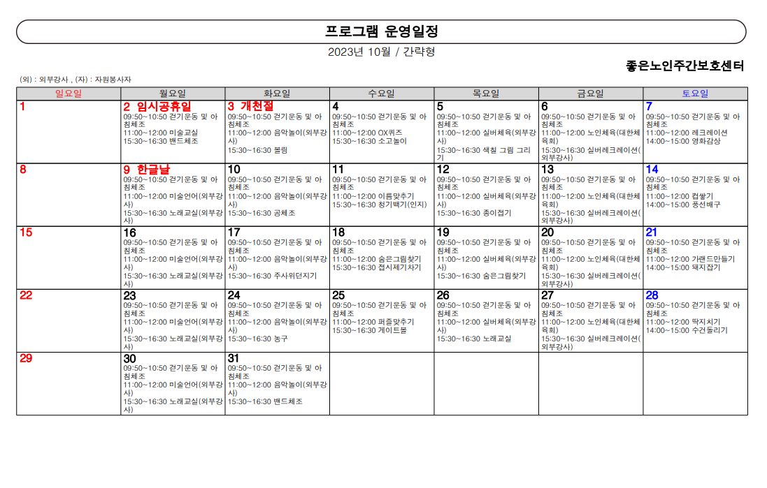 2023년 10월 프로그램 입니다 *^^* 페이지 정보 작성자 최고관리자 작성일 23-09-25 17:07 조회 284회 댓글 0건 본문 2023년 10월 프로그램 입니다 *^^* 이전글2024년 프로그램 계획표 입니다 다음글2023년 9월 프로그램 입니다 *^^* 목록 댓글목록 0 댓글목록 등록된 댓글이 없습니다.
