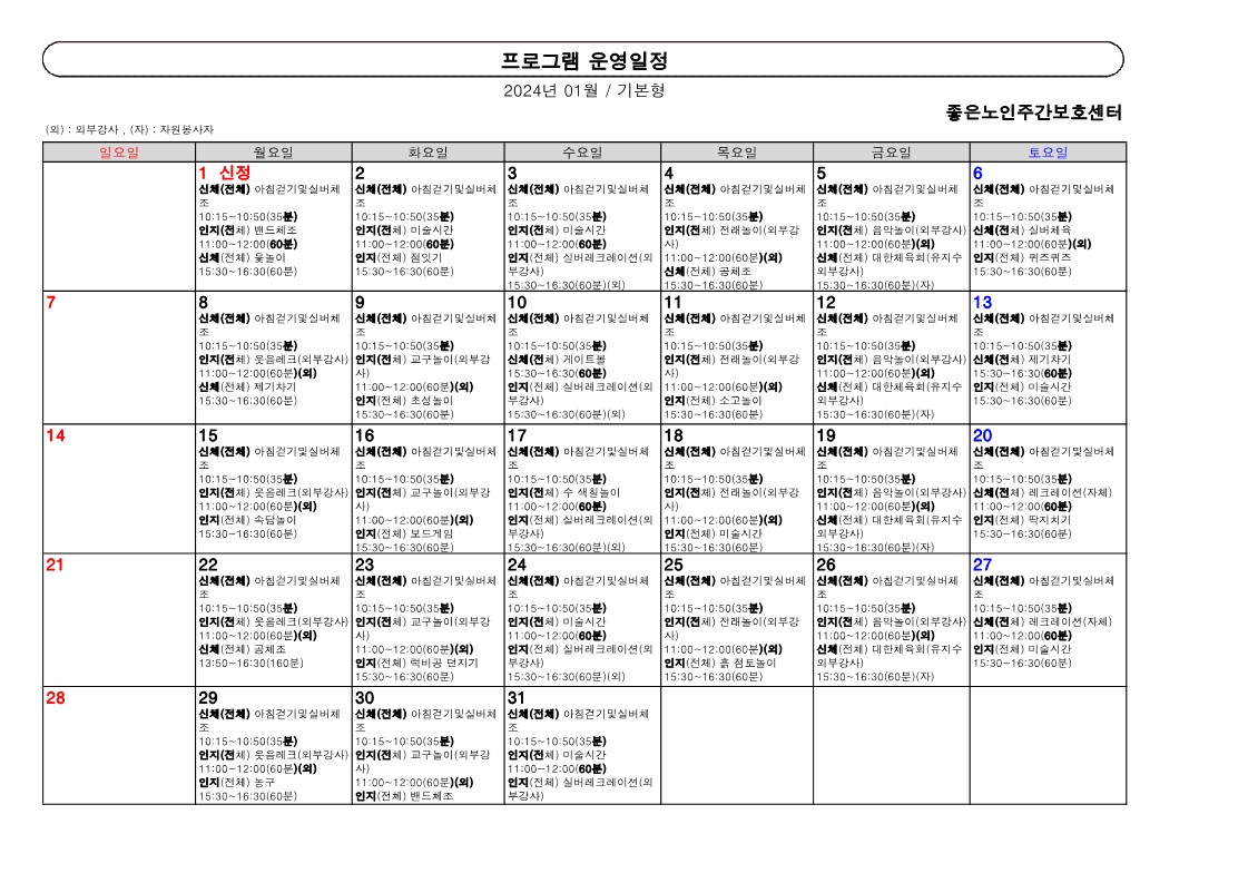 2024년 프로그램 계획표 입니다 페이지 정보 작성자 최고관리자 작성일 24-01-04 11:58 조회 245회 댓글 0건 본문 2024년1월 프로그램 계획표 입니다 이전글24년 2월 프로그램 계획표입니다 다음글2023년 10월 프로그램 입니다 *^^* 목록 댓글목록 0 댓글목록 등록된 댓글이 없습니다.