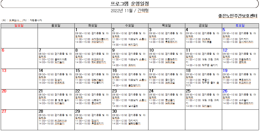 11월 프로그램 계획표입니다 *^^* 페이지 정보 작성자 최고관리자 작성일 22-10-31 14:46 조회 256회 댓글 0건 본문 *** 어르신들과 함께 즐거운 프로그램이 진행됩니다. *** 이전글2022년 12월 프로그램 다음글10월프로그램계획표입니다~*^^* 목록 댓글목록 0 댓글목록 등록된 댓글이 없습니다.