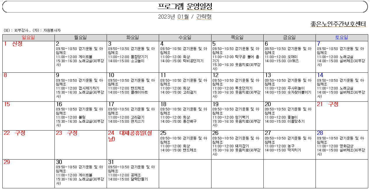 2023년 1월 프로그램입니다 *^^* 페이지 정보 작성자 최고관리자 작성일 23-01-14 10:43 조회 304회 댓글 0건 본문 2023년 01월 프로그램 입니다 *^^* 이전글2023년 2월 프로그램 입니다 *^^* 다음글2022년 12월 프로그램 목록 댓글목록 0 댓글목록 등록된 댓글이 없습니다.