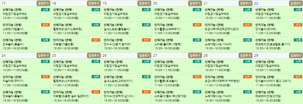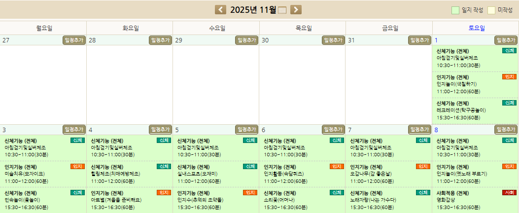 11월 프로그램 계획표입니다. 페이지 정보 작성자 최고관리자 작성일 25-11-01 16:32 조회 60회 댓글 0건 본문 11월 프로그램 계획표입니다. 이전글2025년 12월 프로그램 계획표 입니다. 다음글2025년 10월 프로그램 계획표입니다. 목록 댓글목록 0 댓글목록 등록된 댓글이 없습니다.