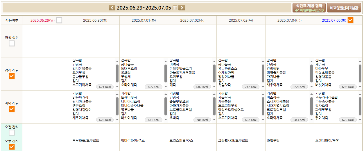 2025년 6월 30일 ~7월 5일 식단표입니다. 페이지 정보 작성자 최고관리자 작성일 25-07-02 15:50 조회 196회 댓글 0건 본문 2025년 6월 30일 ~7월 5일 식단표입니다. 이전글2025년 7월 7일~7월 12일 식단표입니다. 다음글25년 7월 프로그램 계획표 입니다. 목록 댓글목록 0 댓글목록 등록된 댓글이 없습니다.