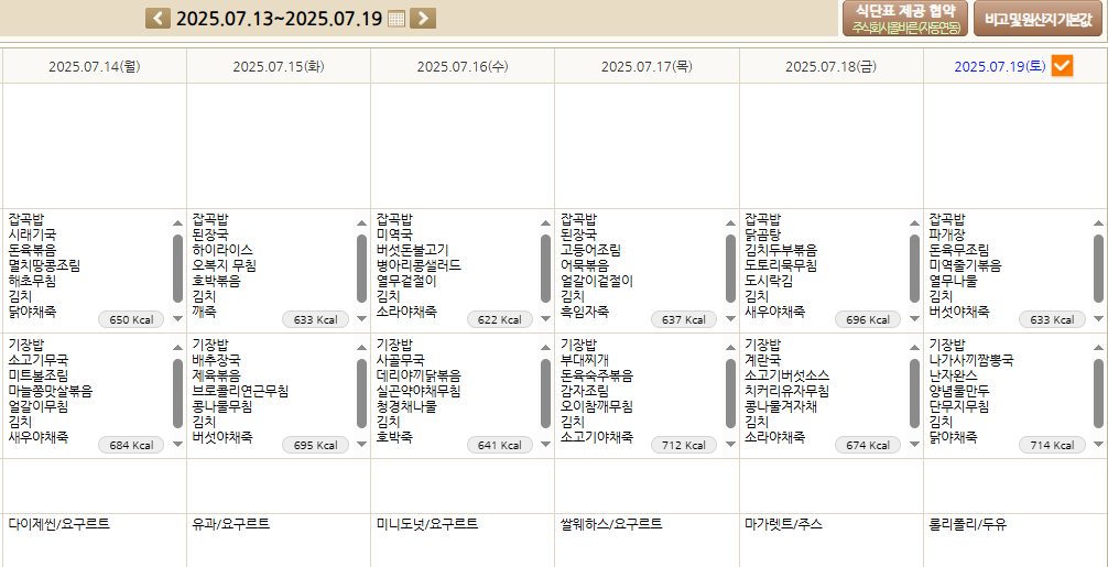 2025년 7월 14일~7월 19일 식단표입니다. 페이지 정보 작성자 최고관리자 작성일 25-07-11 16:34 조회 197회 댓글 0건 본문 2025년 7월 14일~7월 19일 식단표입니다. 이전글2025년 7월 21일 ~7월 26일 식단표입니다. 다음글2025년 7월 7일~7월 12일 식단표입니다. 목록 댓글목록 0 댓글목록 등록된 댓글이 없습니다.