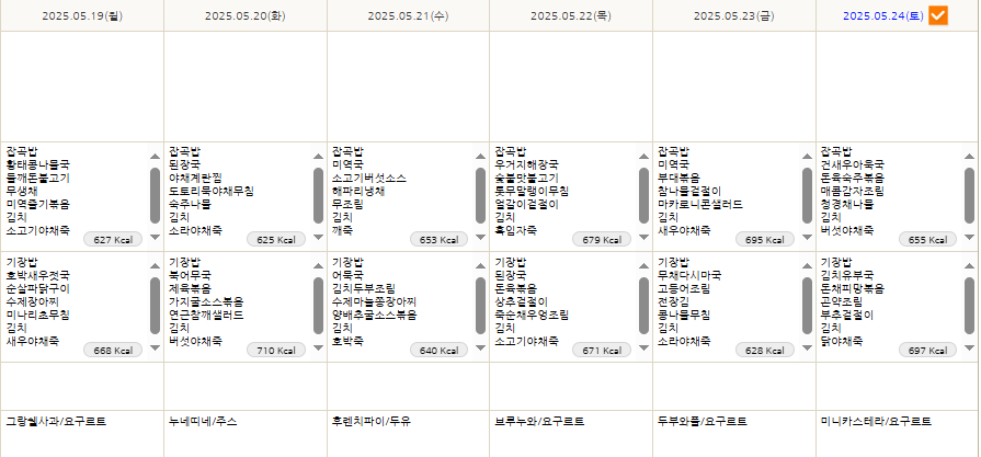 2025년 5월 19~ 5월 24일 식단표입니다. 페이지 정보 작성자 최고관리자 작성일 25-05-16 18:18 조회 230회 댓글 0건 본문 2025년 5월 19~ 5월 24일 식단표입니다. 이전글2025년 5월 26일~5월 31일 식단표 입니다. 다음글2025년 5월5일~5월 17일 식단표입니다. 목록 댓글목록 0 댓글목록 등록된 댓글이 없습니다.