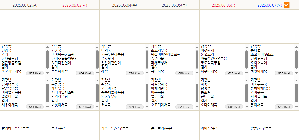 2025년 6월 2일~6월 7일 식단표 입니다. 페이지 정보 작성자 최고관리자 작성일 25-06-02 12:19 조회 211회 댓글 0건 본문 2025년 6월 2일~6월 7일 식단표 입니다. 이전글2025년 6월 9일~6월 14일 식단표 입니다. 다음글2025년 5월 26일~5월 31일 식단표 입니다. 목록 댓글목록 0 댓글목록 등록된 댓글이 없습니다.