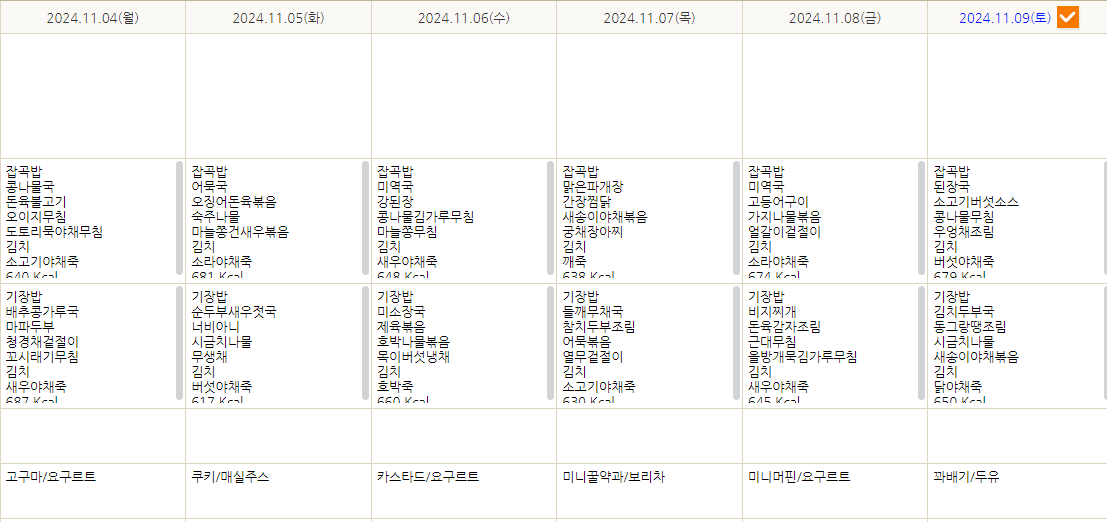 2024-11-04~2024-11-09 페이지 정보 작성자 최고관리자 작성일 24-11-01 14:36 조회 268회 댓글 0건 본문 11월 첫째주 식단표 올려드립니다^^ 이전글11월세째주 식단표 다음글2024.10.27~2024.10.31 목록 댓글목록 0 댓글목록 등록된 댓글이 없습니다.