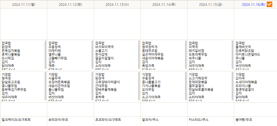 11월세째주 식단표 페이지 정보 작성자 최고관리자 작성일 24-11-11 11:30 조회 250회 댓글 0건 본문 11월11일~11월16일 식단표 이전글2024.11.18~2024.11.23식단표 다음글2024-11-04~2024-11-09 목록 댓글목록 0 댓글목록 등록된 댓글이 없습니다.