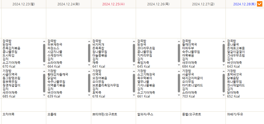 12월23일~12월28일 주간 식단표 페이지 정보 작성자 최고관리자 작성일 24-12-24 16:11 조회 255회 댓글 0건 본문 12월23일~12월28일 주간 식단표 이전글12/30~1/4식단표 다음글12월16~12월21일 식단표 목록 댓글목록 0 댓글목록 등록된 댓글이 없습니다.