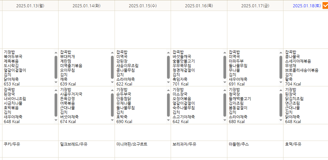 1월13일~1월18일 식단표 페이지 정보 작성자 최고관리자 작성일 25-01-15 12:20 조회 281회 댓글 0건 본문 1월 세째주 식단표 올립니다. 이전글2025년 2월 2일 ~ 8일 식단표 다음글2025년1월6일~1월11일 식단표 목록 댓글목록 0 댓글목록 등록된 댓글이 없습니다.