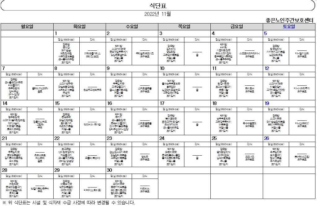 2022년 11월 식단표 입니다 *^^* 페이지 정보 작성자 최고관리자 작성일 22-10-31 14:45 조회 366회 댓글 0건 본문 *** 11월의 맛있는 식사메뉴입니다~ *^^*이미지를 클릭하시면 크고 자세하게 확인이 가능합니다^^ 이전글2022년 12월 식단표 입니다 *^^* 다음글2022년 10월 식단표 입니다 *^^* 목록 댓글목록 0 댓글목록 등록된 댓글이 없습니다.