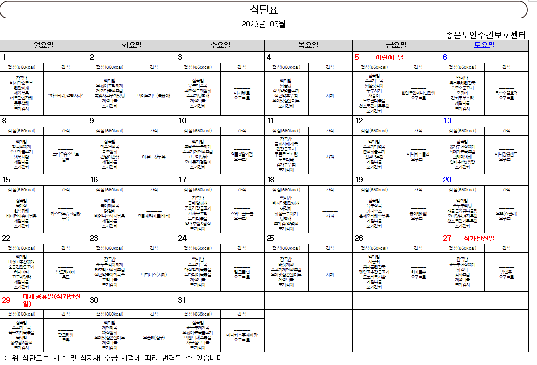 23년 5월 식단표 입니다*^^* 페이지 정보 작성자 최고관리자 작성일 23-05-01 17:23 조회 347회 댓글 0건 본문 5월의 맛있는 식사메뉴입니다~ *^^*이미지를 클릭하시면 크고 자세하게 확인이 가능합니다^^ 이전글23년 6월 식단표 입니다 ~*^^* 다음글23년 4월 식단표 입니다 *^^* 목록 댓글목록 0 댓글목록 등록된 댓글이 없습니다.