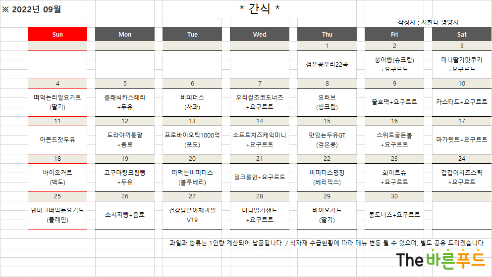 9월 간식표입니다. 페이지 정보 작성자 최고관리자 작성일 22-08-30 17:51 조회 363회 댓글 0건 본문 *** 9월 맛있는 간식메뉴입니다~ *^^*이미지를 클릭하시면 크고 자세하게 확인이 가능합니다^^ 이전글2022년 10월 식단표 입니다 *^^* 다음글9/25 ~ 9/30 식단표입니다. 목록 댓글목록 0 댓글목록 등록된 댓글이 없습니다.