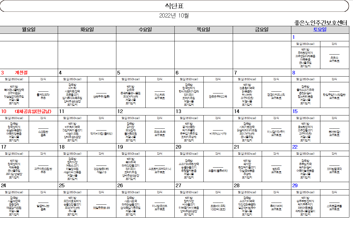 2022년 10월 식단표 입니다 *^^* 페이지 정보 작성자 최고관리자 작성일 22-09-27 11:36 조회 361회 댓글 0건 본문 *** 10월의 맛있는 식사메뉴입니다~ *^^*이미지를 클릭하시면 크고 자세하게 확인이 가능합니다^^ 이전글2022년 11월 식단표 입니다 *^^* 다음글9월 간식표입니다. 목록 댓글목록 0 댓글목록 등록된 댓글이 없습니다.