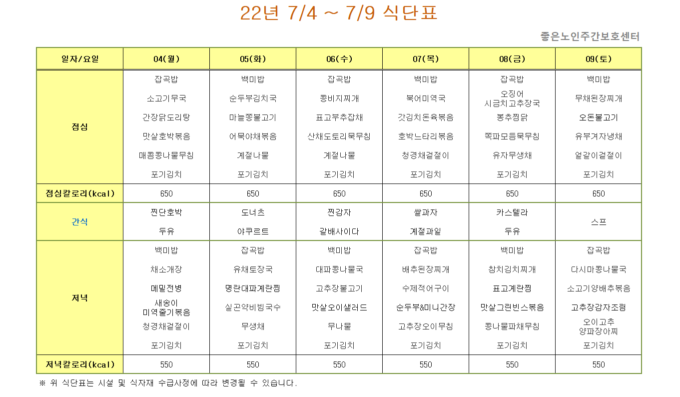 7/4 ~ 7/9 식단표입니다. 페이지 정보 작성자 최고관리자 작성일 22-07-07 11:44 조회 306회 댓글 0건 본문 *** 이번 주의 맛있는 식사메뉴입니다~ *^^* 이전글7/11 ~7/16 식단표입니다. 목록 댓글목록 0 댓글목록 등록된 댓글이 없습니다.