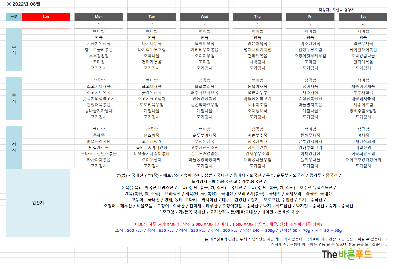 8/1 ~8/6 식단표입니다.