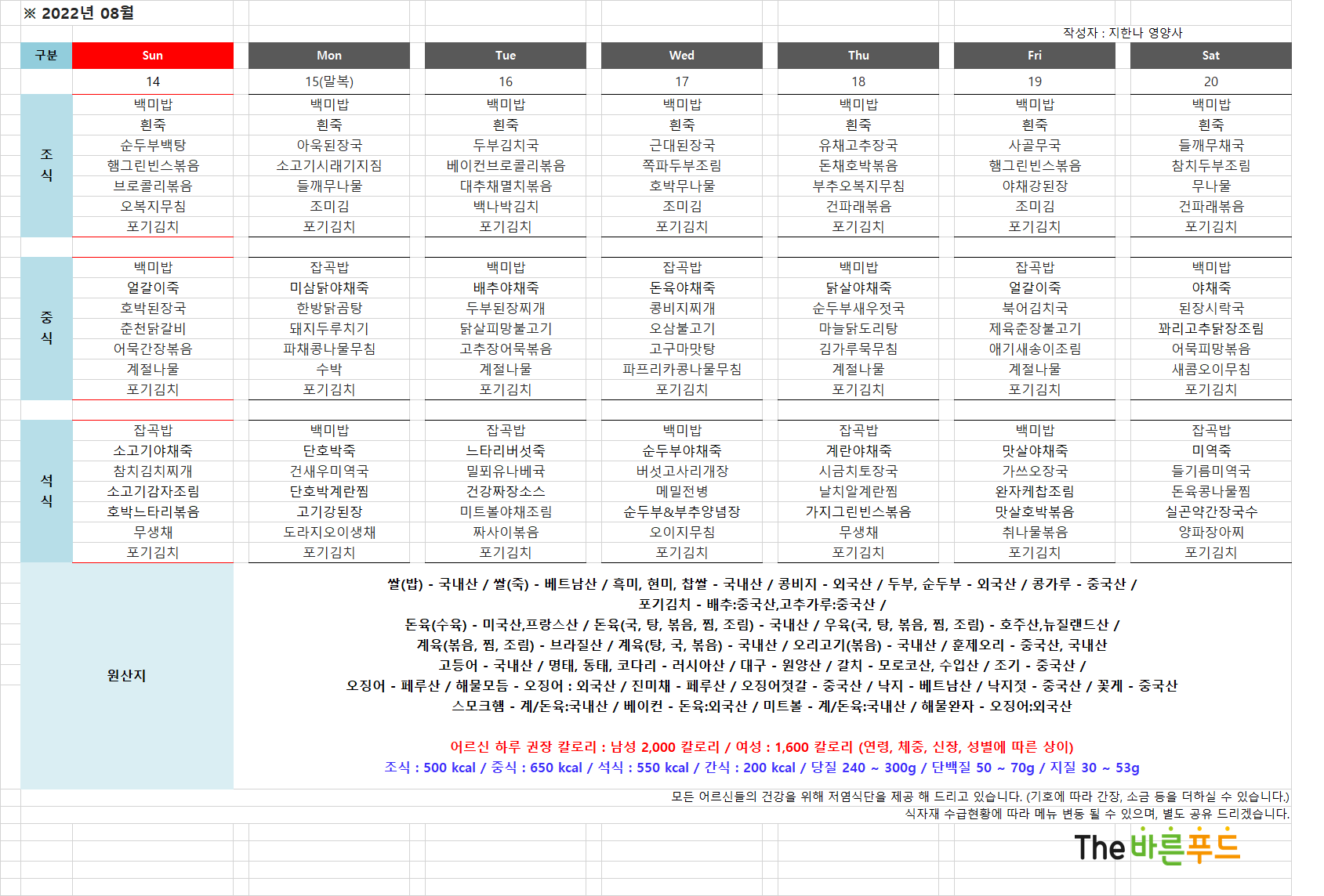 8/14 ~8/20 식단표입니다.