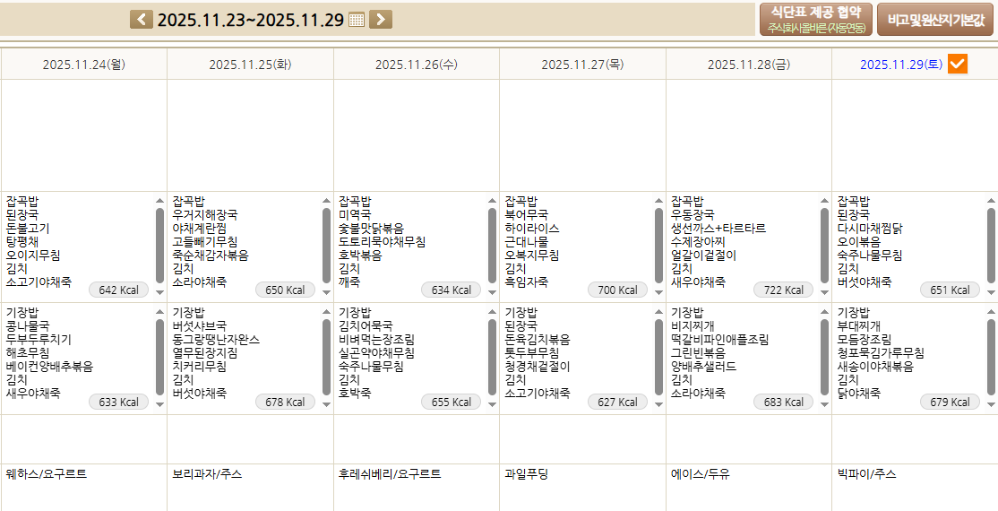 2025년 11월 24일~29일 식단표입니다. 페이지 정보 작성자 최고관리자 작성일 25-11-24 13:14 조회 57회 댓글 0건 본문 2025년 11월 24일~29일 식단표입니다. 이전글2025년 12월 1일~6일 식단표 입니다. 다음글2025년 11월 17일~11월 22일 식단표입니다. 목록 댓글목록 0 댓글목록 등록된 댓글이 없습니다.