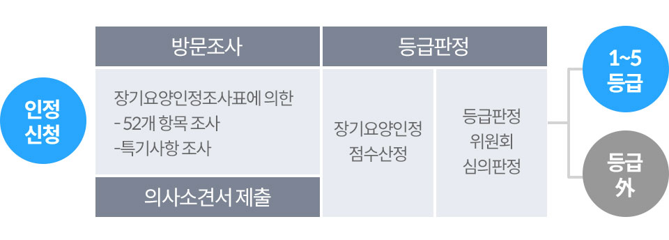 | 신청 대상 | 65세 이상의 노인 또는 65세 미만의 자로서 치매, 뇌혈관성질환 등 대통령령으로 정하는 노인성 질병을 가진 자 |