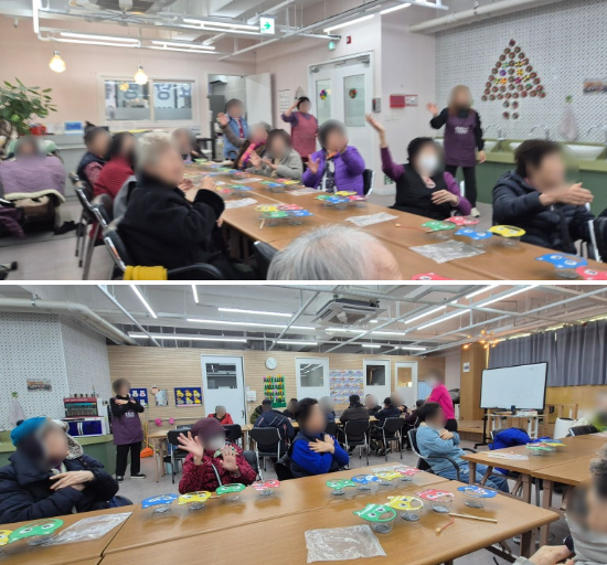 물고기의 색깔에 따라 박수 치기를 다르게 하며 단기 집중력과 기억력을 활성화해 보았습니다. 예를 들어, 빨간 물고기를 잡았을 때는 두 번 박수를 치고, 파란 물고기를 잡았을 때는 한 번 박수를 쳐보면서 어르신들의 기억력과 시지각력을 높였고, 낚시를 하며 집중력과 소근육 자극을 길러보았습니다.