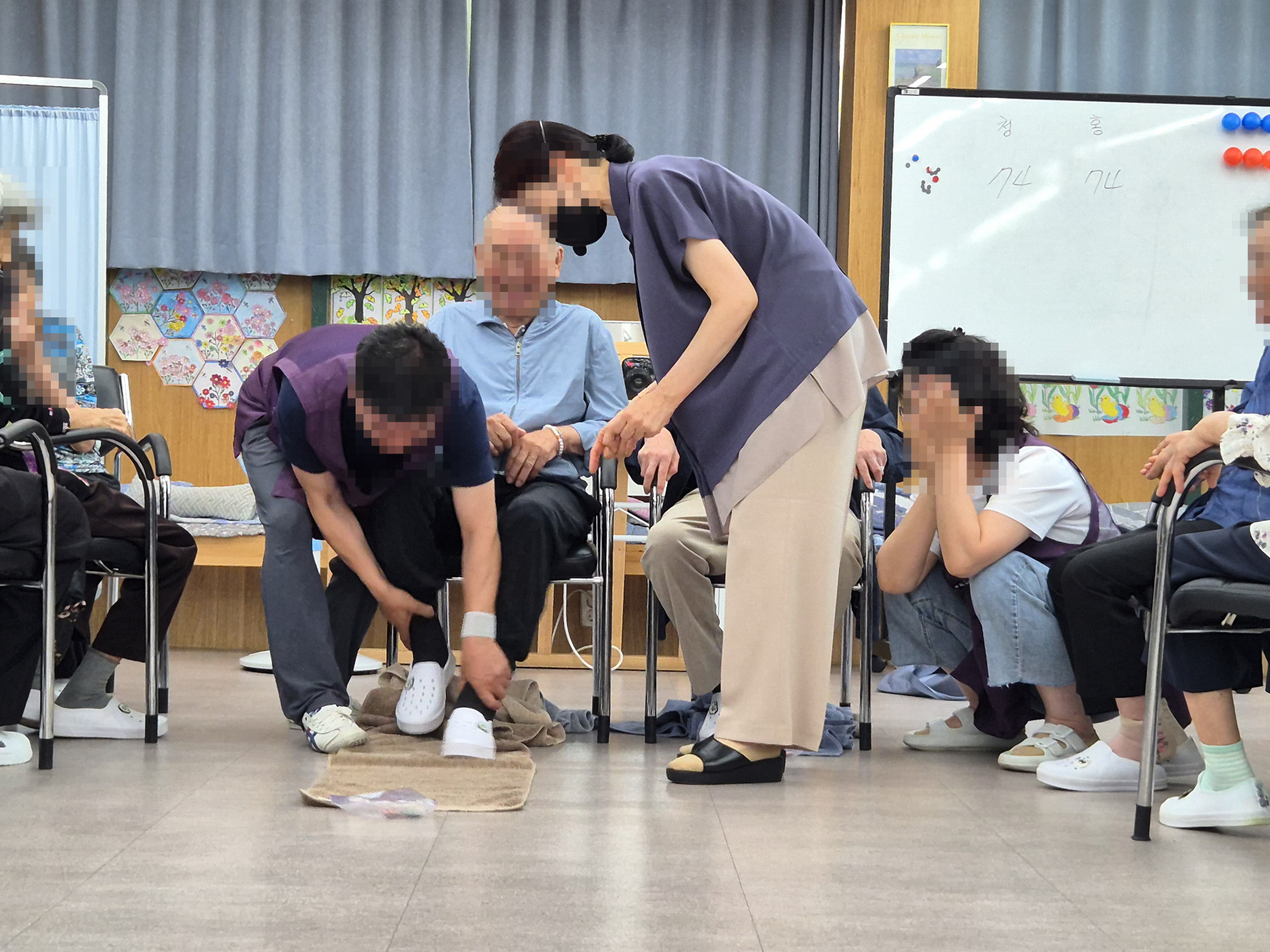 남자 어르신의 다리가 불편해 선생님이 손으로 도움을 주시니 우리 어르신 얼굴에 웃음꽃이 피었습니다.