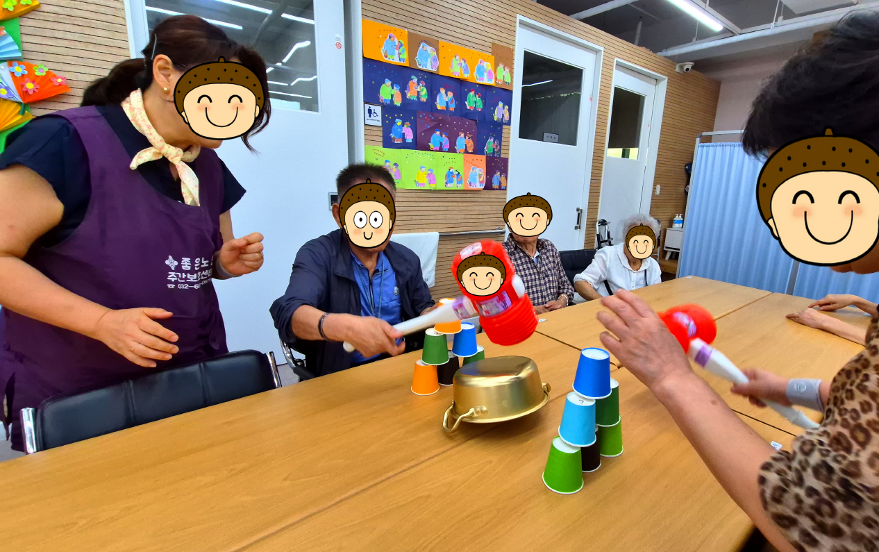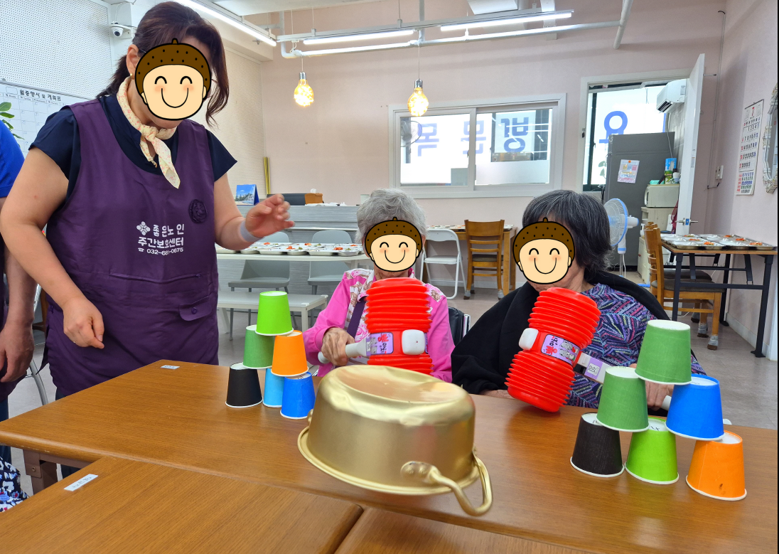 뿅망치를 내려놓고 재빨리 종이컵 탑을 쌓으실 수 있도록 격려드리며 게임을 진행해 보았는데