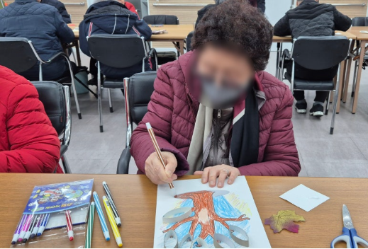 먼저 도화지에 그려진 나무 밑그림을 색칠했어요. 어르신들은 저마다 좋아하는 색깔로 나무의 옹이와 나뭇결을 정성껏 표현하시며, 소근육을 섬세하게 움직이셨답니다.