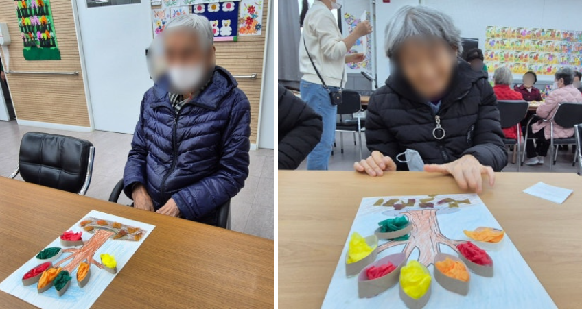 마지막으로 가을 분위기를 물씬 풍기는 나뭇잎 모형을 붙여 예쁜 낙엽을 표현해 주셨어요. 어르신들의 창의력이 더해져 세상에 하나뿐인 멋진 가을나무가 완성되었습니다!