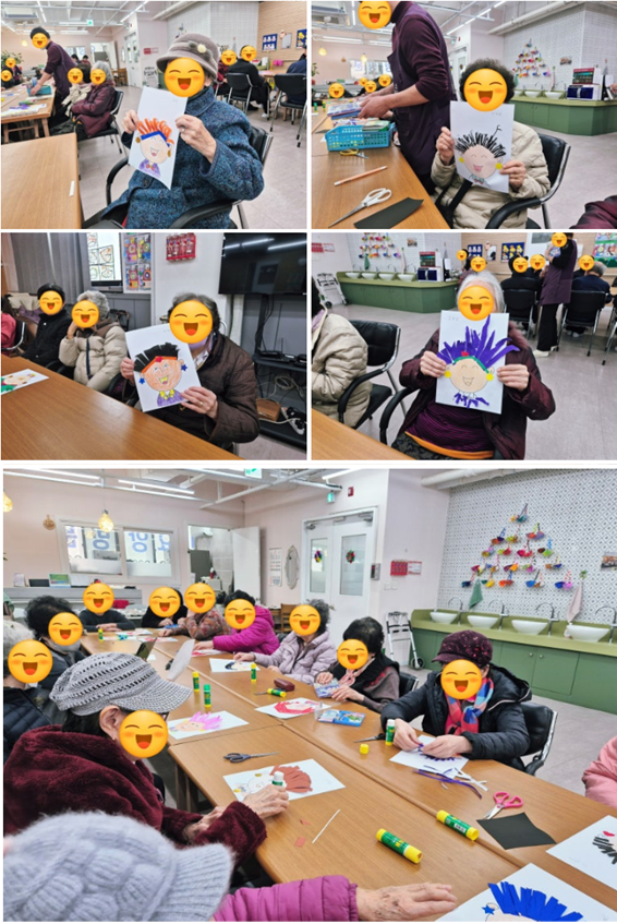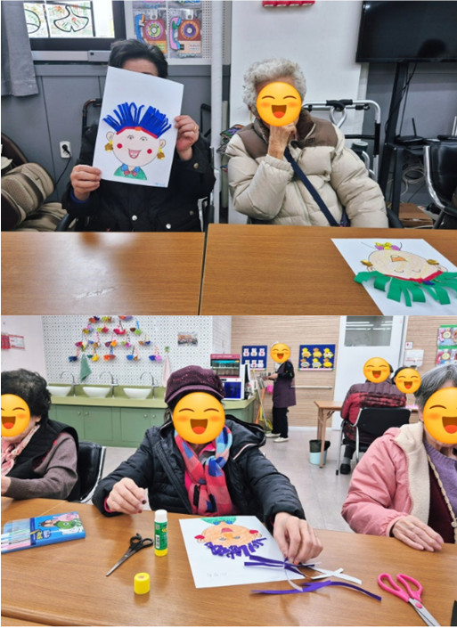 어르신들이 밑그림 색칠위에 색종이로 직접 내 얼굴 꾸미기를 해주셨습니다.