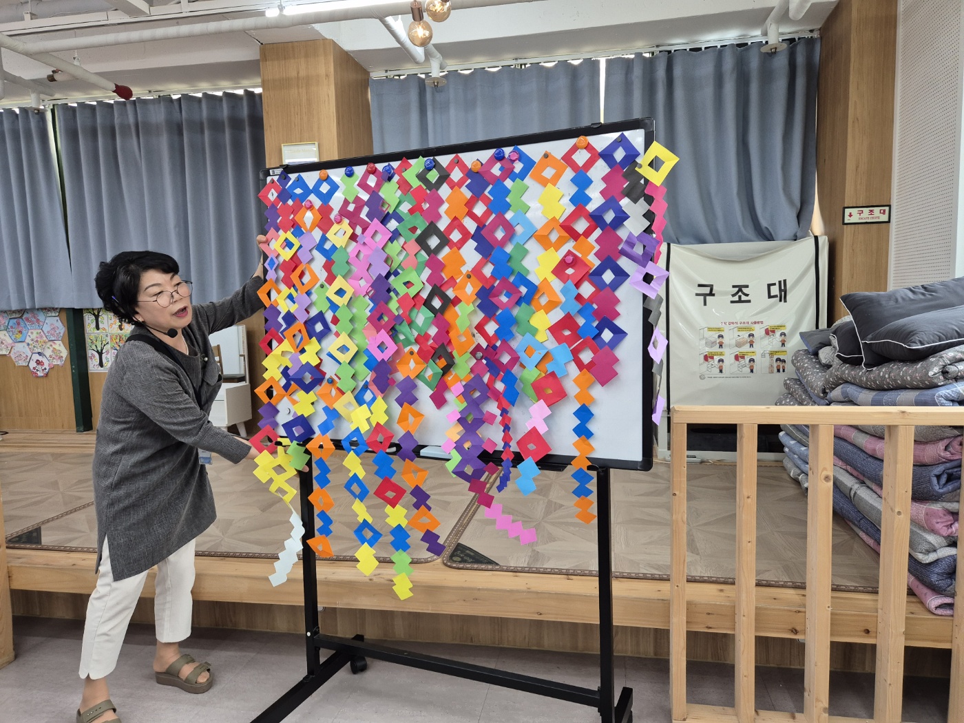 색종이를 잘라 모빌로 만들고 모두 모아보니 꽤 근사하게 보입니다.