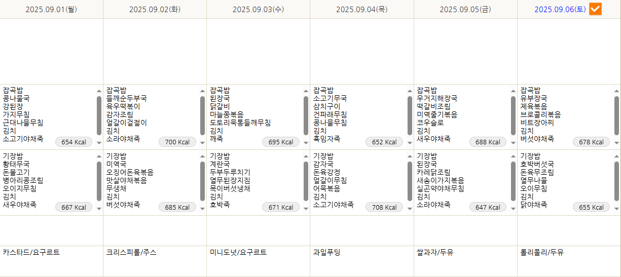 2025년 9월 1일~9월 6일 까지 식단표 입니다. 페이지 정보 작성자 최고관리자 작성일 25-09-01 17:55 조회 154회 댓글 0건 본문 2025년 9월 1일~9월 6일 까지 식단표 입니다. 이전글2025년 9월 8일~9월 13일 식단표입니다. 다음글8월 25일~8월 30일 식단표입니다. 목록 댓글목록 0 댓글목록 등록된 댓글이 없습니다.