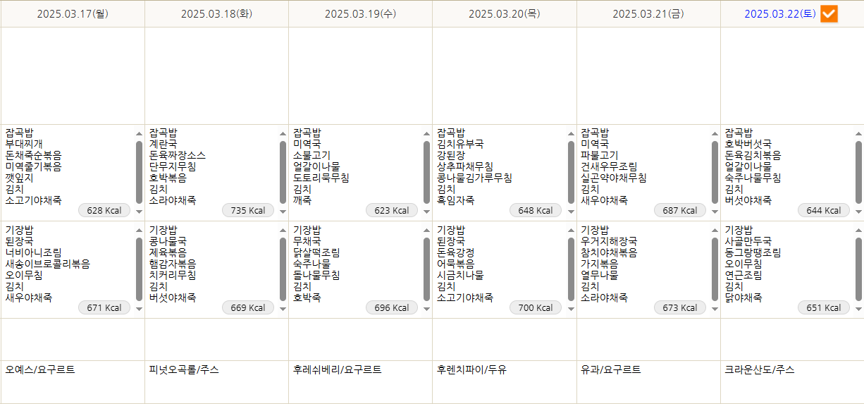 2025년 3월 17~3월 22일 식단표 입니다. 페이지 정보 작성자 최고관리자 작성일 25-03-17 15:17 조회 257회 댓글 0건 본문 2025년 3월 17~3월 22일 식단표 입니다. 이전글2025.03.24~03.29 식단표입니다. 다음글3월 10일~ 3월 15일 식단표입니다. 목록 댓글목록 0 댓글목록 등록된 댓글이 없습니다.