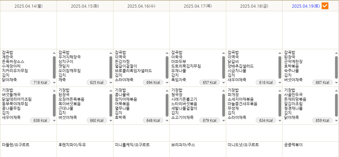 2025년 4월 14~4월 19일 식단표입니다 페이지 정보 작성자 최고관리자 작성일 25-04-14 10:46 조회 266회 댓글 0건 본문 2025년 4월 14~4월 19일 식단표입니다 이전글2025년 4월 21일~26일 식단표 입니다. 다음글2025년 4월 7일~4월 12일 식단표입니다. 목록 댓글목록 0 댓글목록 등록된 댓글이 없습니다.