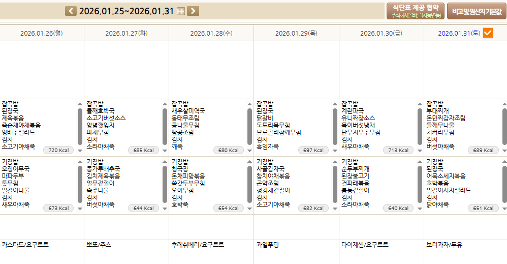 2026년 1월 26일~31일 식단표 입니다. 페이지 정보 작성자 최고관리자 작성일 26-01-23 15:29 조회 1회 댓글 0건 본문 2026년 1월 26일~31일 식단표 입니다. 다음글2026년 1월 19~24일 식단표 입니다. 목록 댓글목록 0 댓글목록 등록된 댓글이 없습니다.