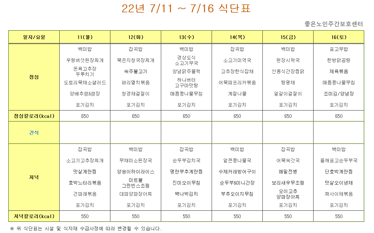7/11 ~7/16 식단표입니다. 페이지 정보 작성자 최고관리자 작성일 22-07-08 13:15 조회 323회 댓글 0건 본문 *** 7월 세째주의 맛있는 식사메뉴입니다~ *^^* 이전글8/1 ~8/6 식단표입니다. 다음글7/4 ~ 7/9 식단표입니다. 목록 댓글목록 0 댓글목록 등록된 댓글이 없습니다.