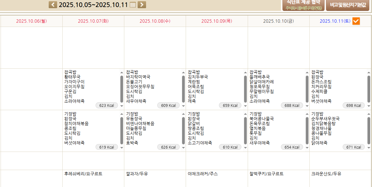 2025년 10월 7일~11일 식단표입니다. 페이지 정보 작성자 최고관리자 작성일 25-10-04 13:54 조회 104회 댓글 0건 본문 2025년 10월 7일~11일 식단표입니다. 이전글2025년 10월 13일 ~18일 식단표입니다. 다음글2025년 9월 27일~ 10월 4일 식단표입니다. 목록 댓글목록 0 댓글목록 등록된 댓글이 없습니다.