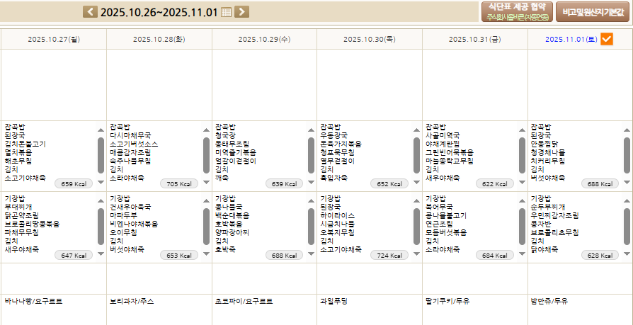 2025년 10월 27일~11월 01일 식단표입니다. 페이지 정보 작성자 최고관리자 작성일 25-10-25 16:05 조회 79회 댓글 0건 본문 2025년 10월 27일~11월 01일 식단표입니다. 이전글2025년 11월 3일 ~8일 식단표 입니다. 다음글2025년 10월 20일~25일 식단표입니다. 목록 댓글목록 0 댓글목록 등록된 댓글이 없습니다.