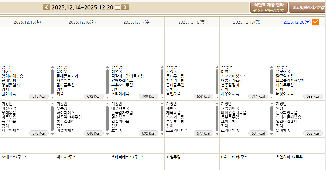 2025년 12월 15일~20일 식단표입니다. 페이지 정보 작성자 최고관리자 작성일 25-12-15 09:43 조회 52회 댓글 0건 본문 2025년 12월 15일~20일 식단표입니다. 이전글2025년 12월 29일 ~1월 3일 식단표입니다. 다음글2025년 12월 13일~15일 식단표 입니다. 목록 댓글목록 0 댓글목록 등록된 댓글이 없습니다.