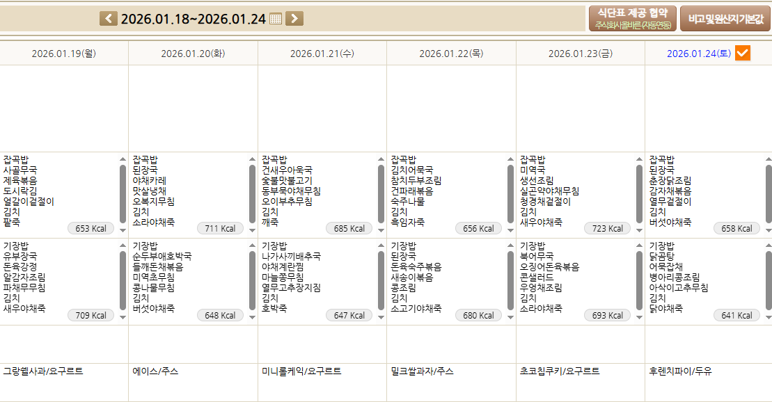 2026년 1월 19~24일 식단표 입니다. 페이지 정보 작성자 최고관리자 작성일 26-01-16 09:29 조회 8회 댓글 0건 본문 2026년 1월 19~24일 식단표 입니다. 다음글2026년 1월 12일~1월 17일 식단표 입니다. 목록 댓글목록 0 댓글목록 등록된 댓글이 없습니다.