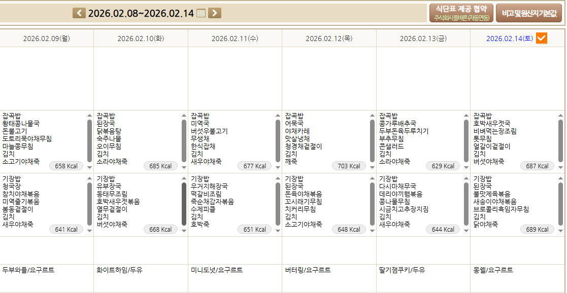2026년 2월 9~14일 식단표 입니다. 페이지 정보 작성자 최고관리자 작성일 26-02-06 14:18 조회 19회 댓글 0건 본문 2026년 2월 9~14일 식단표 입니다. 이전글2026년 2월 16일~2월 21일 식단표입니다. 다음글2026년 2월 2일~7일 식단표입니다. 목록 댓글목록 0 댓글목록 등록된 댓글이 없습니다.